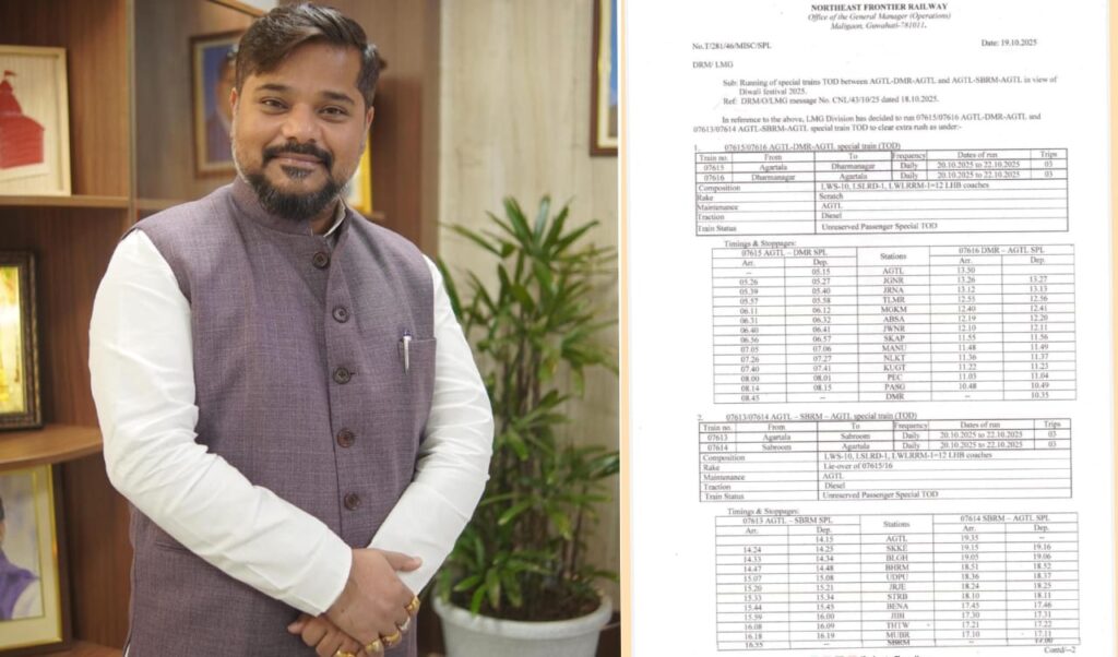 জনতার কলম আগরতলা প্রতিনিধি:-আসন্ন দীপাবলি ২০২৫ উপলক্ষে এবং উত্তর ত্রিপুরার ধর্মনগর ও উদয়পুরের প্রখ্যাত ত্রিপুরা সুন্দরী মন্দিরে ভক্তদের ভিড় বৃদ্ধির প্রেক্ষাপটে, নর্থইস্ট ফ্রন্টিয়ার রেলওয়ে (NFR) ঘোষণা করেছে দুইটি বিশেষ অ-আসনসংক্রান্ত যাত্রী ট্রেন চালানোর।