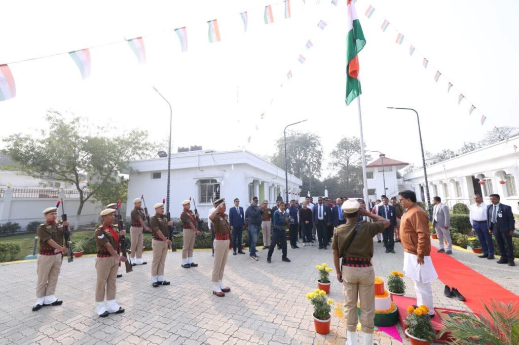 জনতার কলম ত্রিপুরা আগরতলা প্রতিনিধি:- ৭৭তম প্রজাতন্ত্র দিবসের পবিত্র ও গৌরবময় উপলক্ষে ত্রিপুরার মুখ্যমন্ত্রী অধ্যাপক ডা. মানিক সাহা আগরতলার শ্যামাপ্রসাদ লেনস্থ তাঁর সরকারি বাসভবনে জাতীয় পতাকা উত্তোলন করেন। পতাকা উত্তোলনের মাধ্যমে তিনি সংবিধানের পবিত্র আদর্শ ও প্রজাতন্ত্রের চিরন্তন চেতনাকে নতুন করে স্মরণ ও সম্মান জানান।