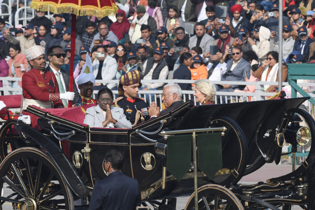 এরপর রাষ্ট্রপতি দ্রৌপদী মুর্মু বিশেষ শোভাযাত্রার বাগিতে করে কার্তব্য পথে পৌঁছন। তাঁর সঙ্গে উপস্থিত ছিলেন এবছরের প্রধান অতিথি— ইউরোপীয় কাউন্সিলের প্রেসিডেন্ট আন্তোনিও কস্তা এবং ইউরোপীয় কমিশনের প্রেসিডেন্ট উরসুলা ভন ডার লেয়েন। জাতীয় পতাকা উত্তোলনের পর জাতীয় সংগীত পরিবেশন করা হয় এবং ১০৫ মিমি লাইট ফিল্ড গান থেকে ২১ বার তোপধ্বনির মাধ্যমে রাষ্ট্রপতিকে সম্মান জানানো হয়। এই অনুষ্ঠানে রাষ্ট্রপতি ভারতীয় বায়ুসেনার গ্রুপ ক্যাপ্টেন শুভাংশু শুক্লা-কে দেশের সর্বোচ্চ শান্তিকালীন বীরত্ব সম্মান অশোক চক্র প্রদান করেন।