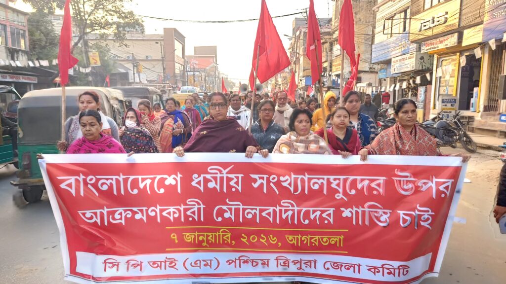 জনতার কলম ত্রিপুরা আগরতলা প্রতিনিধি :- বাংলাদেশে ধর্মীয় সংখ্যালঘুদের উপর ধারাবাহিক হামলার প্রতিবাদে ও দোষীদের দ্রুত শাস্তির দাবিতে শহরের রাজপথে প্রতিবাদ মিছিল সংগঠিত করল সিপিআই(এম)-এর পশ্চিম ত্রিপুরা জেলা কমিটি। মিছিলে দলীয় নেতা-কর্মীদের পাশাপাশি সাধারণ মানুষও অংশগ্রহণ করেন।