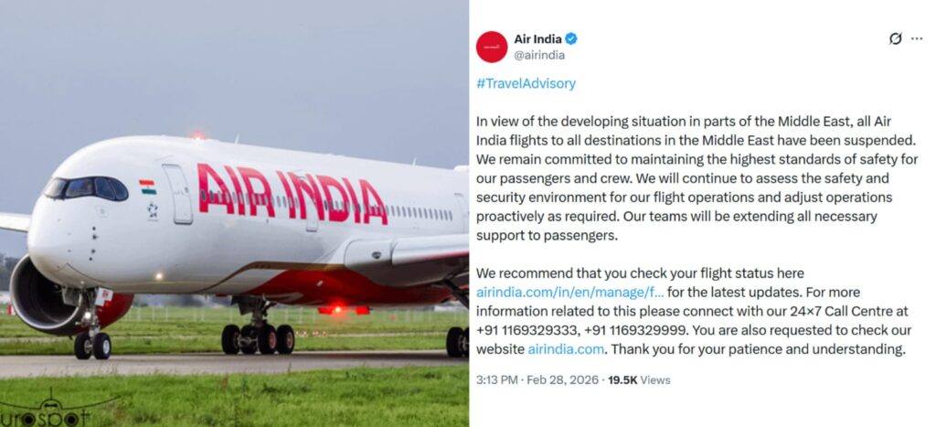 এয়ার ইন্ডিয়া এক বিবৃতিতে জানায়, যাত্রী ও বিমানকর্মীদের সর্বোচ্চ নিরাপত্তা নিশ্চিত করাই তাদের প্রধান অগ্রাধিকার। বর্তমান নিরাপত্তা পরিস্থিতি নিয়মিতভাবে পর্যবেক্ষণ করা হচ্ছে এবং পরিস্থিতির আলোকে প্রয়োজনীয় ব্যবস্থা গ্রহণ করা হবে। নিরাপত্তা ও সুরক্ষা পরিবেশ বিবেচনা করে ভবিষ্যতেও উড়ান পরিচালনার বিষয়ে সক্রিয়ভাবে সিদ্ধান্ত নেওয়া হবে বলে সংস্থার তরফে জানানো হয়েছে।
