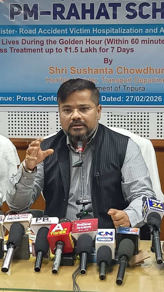 জনতার কলম ত্রিপুরা আগরতলা প্রতিনিধি :- সড়ক দুর্ঘটনার শিকার ব্যক্তিদের তাৎক্ষনিক চিকিৎসা পরিষেবা যাতে বাধাপ্রাপ্ত না হয় তারজন্য শুরু করা হয়েছে প্রধানমন্ত্রী রাহত (PM-RAHT) প্রকল্প। কেন্দ্রীয় সড়ক, যোগাযোগ এবং মহাসড়ক মন্ত্রকের অধীনে এই প্রকল্প পরিচালিত হবে। এই প্রকল্পে দুর্ঘটনার শিকার ব্যক্তিদের হাসপাতালে সর্বোচ্চ ৭দিনের চিকিৎসা করানোর জন্য সর্বাধিক ১ লক্ষ ৫০ হাজার টাকা সহায়তা করা হবে। যদিও এর অতিরিক্ত অর্থ চিকিৎসা পরিষেবা গ্রহণকারী ব্যক্তিদের পরিবারকেই বহন করতে হবে। আজ সচিবালয়ের প্রেস কনফারেন্স হলে আয়োজিত সাংবাদিক সম্মেলনে এই প্রকল্প সম্পর্কে বিস্তারিত তথ্য তুলে ধরে একথা বলেন পরিবহন মন্ত্রী সুশান্ত চৌধুরী। তিনি বলেন, পরিবহন, আরক্ষা, স্বাস্থ্য ও পরিবার কল্যাণ দপ্তর যৌথভাবে এই প্রকল্প বাস্তবায়নে সহযোগিতা করবে।