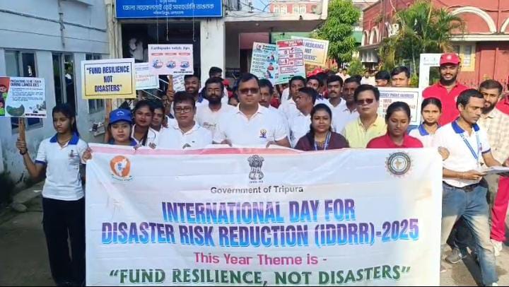 জনতার কলম আগরতলা প্রতিনিধি :- “আন্তর্জাতিক দুর্যোগ ঝুঁকি হ্রাস দিবস-২০২৫” উপলক্ষে সোমবার আগরতলা পশ্চিম জেলার উদ্যোগে একটি সচেতনতামূলক শোভাযাত্রার আয়োজন করা হয়। শোভাযাত্রাটি পশ্চিম ত্রিপুরা জেলার জেলা ম্যাজিস্ট্রেট ও কালেক্টরের কার্যালয় প্রাঙ্গণ থেকে শুরু হয়ে শহরের বিভিন্ন পথ পরিক্রমা করে পুনরায় জেলা কার্যালয়ে গিয়ে শেষ হয়।