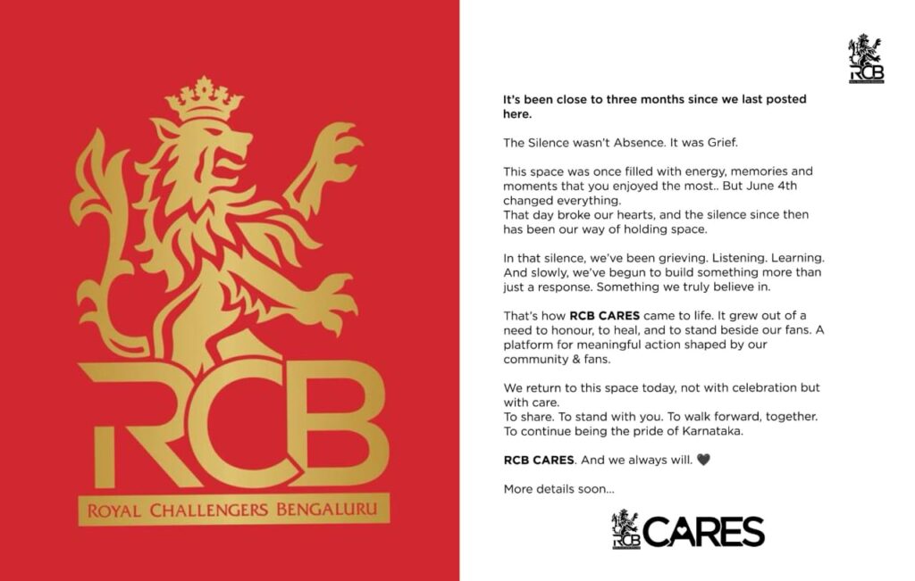 আরসিবি তাদের আনুষ্ঠানিক সোশ্যাল মিডিয়া প্ল্যাটফর্ম এক্স-এ একটি আবেগপ্রবণ চিঠিতে ‘১২তম খেলোয়াড় সেনা’ ভক্তদের উদ্দেশে লিখেছে যে, তাদের নীরবতা ছিল অনুপস্থিতি নয়, বরং শোক। তারা আন্তরিক সমবেদনা প্রকাশ করেছেন এবং জানিয়েছেন কীভাবে এই দুর্ঘটনা তাদের উদযাপন এবং দৃষ্টিভঙ্গি পরিবর্তন করেছে।