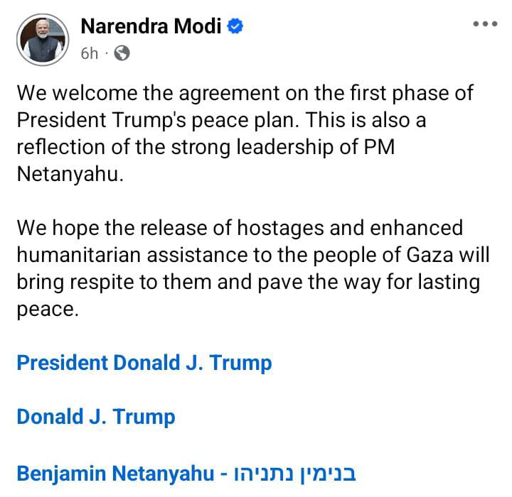 একটি সামাজিক মাধ্যমে পোস্ট করে প্রধানমন্ত্রী মোদী আশা প্রকাশ করেছেন, জিম্মিদের মুক্তি ও গাজা উপত্যকার সাধারণ মানুষের জন্য মানবিক সহায়তা বৃদ্ধি তাঁদের স্বস্তি এনে দেবে এবং এই পদক্ষেপ দীর্ঘস্থায়ী শান্তির পথ প্রশস্ত করবে।