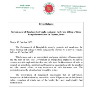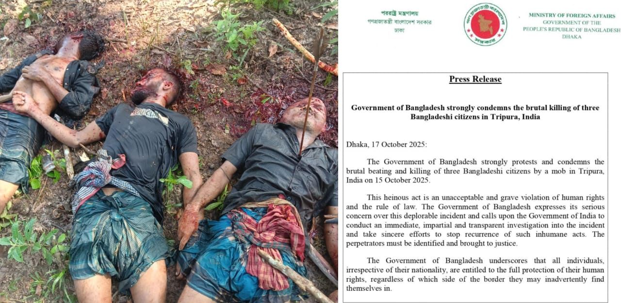 জনতার কলম আগরতলা প্রতিনিধি :-ত্রিপুরার খোয়াই জেলায় গরু চুরির অভিযোগে তিন বাংলাদেশি নাগরিককে পিটিয়ে হত্যা করার ঘটনায় শুক্রবার বাংলাদেশের পররাষ্ট্র মন্ত্রণালয় কঠোর নিন্দা জানিয়েছে। নিহতরা হলেন জুয়াল মিয়া, সাজল মিয়া ও পণ্ডিত মিয়া।