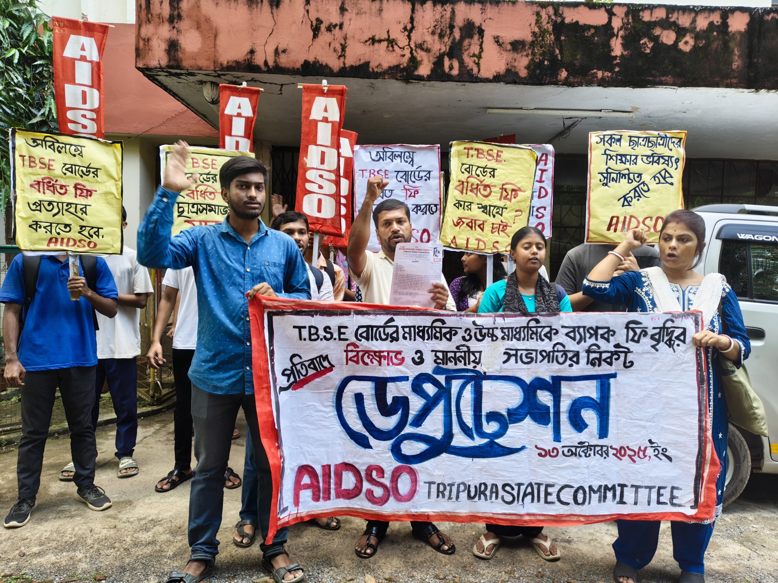 জনতার কলম আগরতলা প্রতিনিধি :-ত্রিপুরা মধ্যশিক্ষা পর্ষদের সিদ্ধান্তে মাধ্যমিক ও উচ্চমাধ্যমিক পরীক্ষার্থীদের ফি বৃদ্ধিকে কেন্দ্র করে ক্ষোভ প্রকাশ করেছে অল ইন্ডিয়া ডেমোক্রেটিক স্টুডেন্টস অর্গানাইজেশন (এআইডিএসও)-এর ত্রিপুরা রাজ্য কমিটি। সংগঠনের পক্ষ থেকে এক বিবৃতিতে জানানো হয়েছে, পর্ষদ গত ১০ অক্টোবর থেকে ভিন্ন ভিন্ন ১৬টি খাতে অস্বাভাবিক হারে ফি বৃদ্ধি করেছে, যা গত বছরের তুলনায় দেড়শো থেকে আড়াইশো গুণ বেশি।
