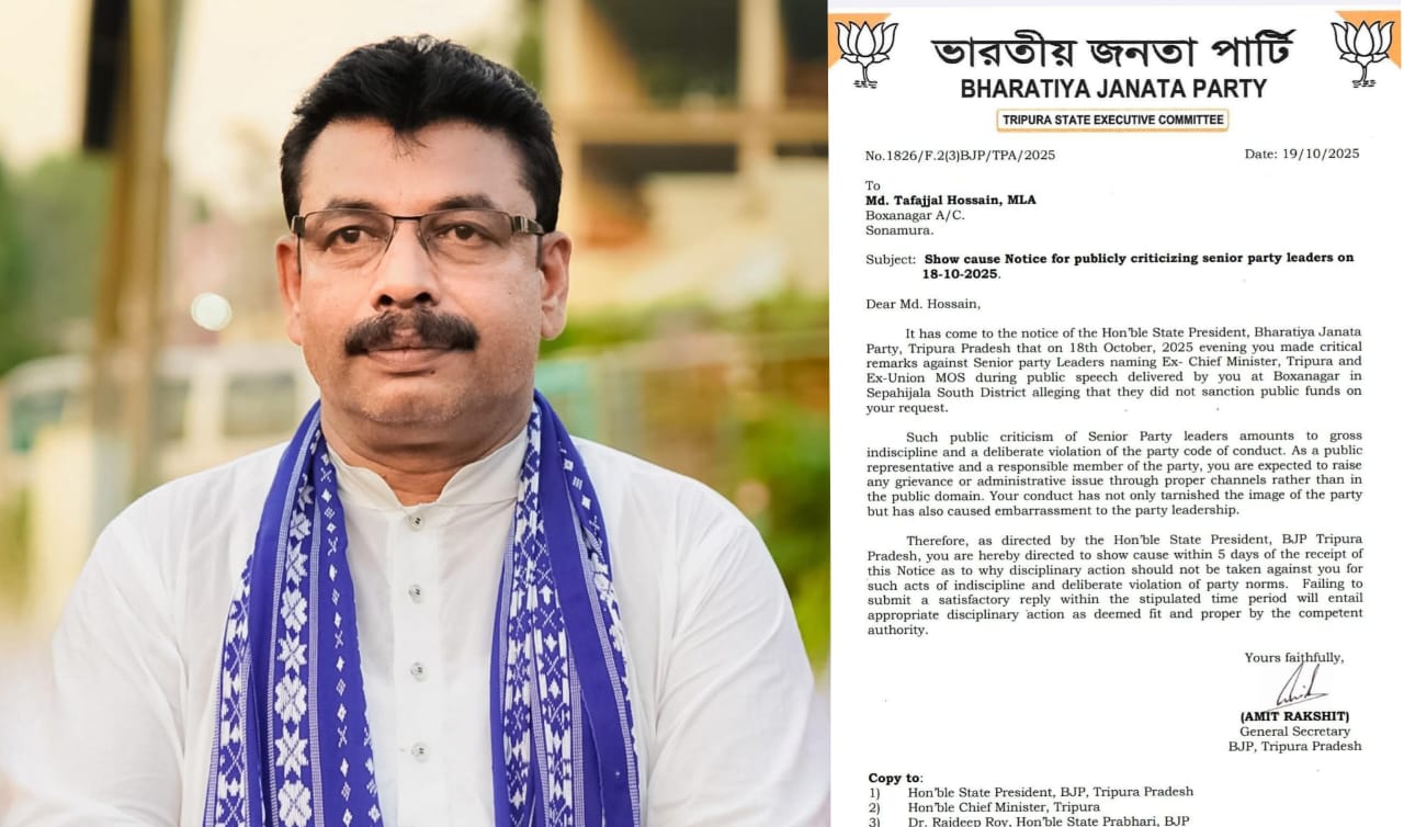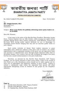 জনতার কলম আগরতলা প্রতিনিধি :- ত্রিপুরা প্রদেশ বিজেপি বিধায়ক এমডি তোফাজ্জল হোসেনের বিরুদ্ধে শোকজ নোটিশ জারি করা হয়েছে। কারণ, সম্প্রতি এক জনসভায় তিনি সিনিয়র নেতাদের সমালোচনা করেছেন।
