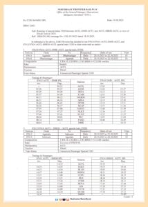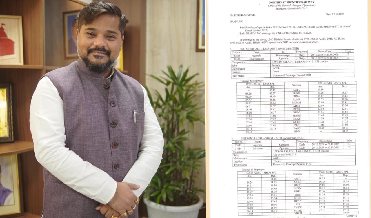 প্রেস বিজ্ঞপ্তিতে NFR জানিয়েছে, LMG ডিভিশন 07615/07616 AGTL-DMR-AGTL এবং 07613/07614 AGTL-SBRM-AGTL বিশেষ ট্রেন চালানোর সিদ্ধান্ত নিয়েছে ভিড় সামলানোর জন্য। ট্রেন 07615 ও 07616 আগরতলা থেকে ধর্মনগরের মধ্যে চলবে ২০ থেকে ২২ অক্টোবর ২০২৫ পর্যন্ত। একই সময়ে 07613 ও 07614 ট্রেন আগরতলা থেকে সব্রুম পর্যন্ত যাত্রী পরিবহন করবে, যাতে উৎসবকালে ভ্রমণ নির্বিঘ্ন হয়।