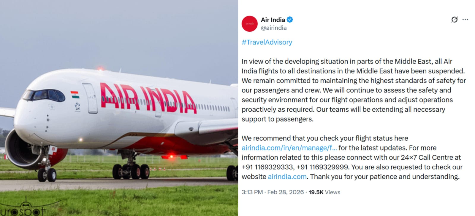 জনতার কলম ওয়েবডেস্ক :- মধ্যপ্রাচ্যের বিভিন্ন অংশে উদ্ভূত পরিস্থিতির প্রেক্ষিতে গুরুত্বপূর্ণ সিদ্ধান্ত নিল এয়ার ইন্ডিয়া। সংস্থার পক্ষ থেকে জানানো হয়েছে, মধ্যপ্রাচ্যের সমস্ত গন্তব্যে এয়ার ইন্ডিয়ার সব উড়ান আপাতত স্থগিত রাখা হয়েছে।
