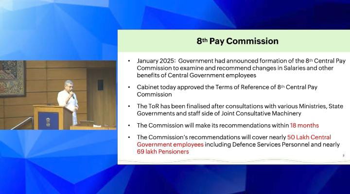 জনতার কলম ওয়েবডেস্ক:- মঙ্গলবার নয়াদিল্লিতে অনুষ্ঠিত কেন্দ্রীয় মন্ত্রিসভার বৈঠকে একাধিক গুরুত্বপূর্ণ সিদ্ধান্ত গৃহীত হয়েছে। তথ্য ও সম্প্রচার মন্ত্রী অশ্বিনী বৈষ্ণব সাংবাদিক বৈঠকে জানান, মন্ত্রিসভা ৮ম কেন্দ্রীয় বেতন কমিশনের (8th Central Pay Commission) শর্তাবলী (Terms of Reference) অনুমোদন করেছে।