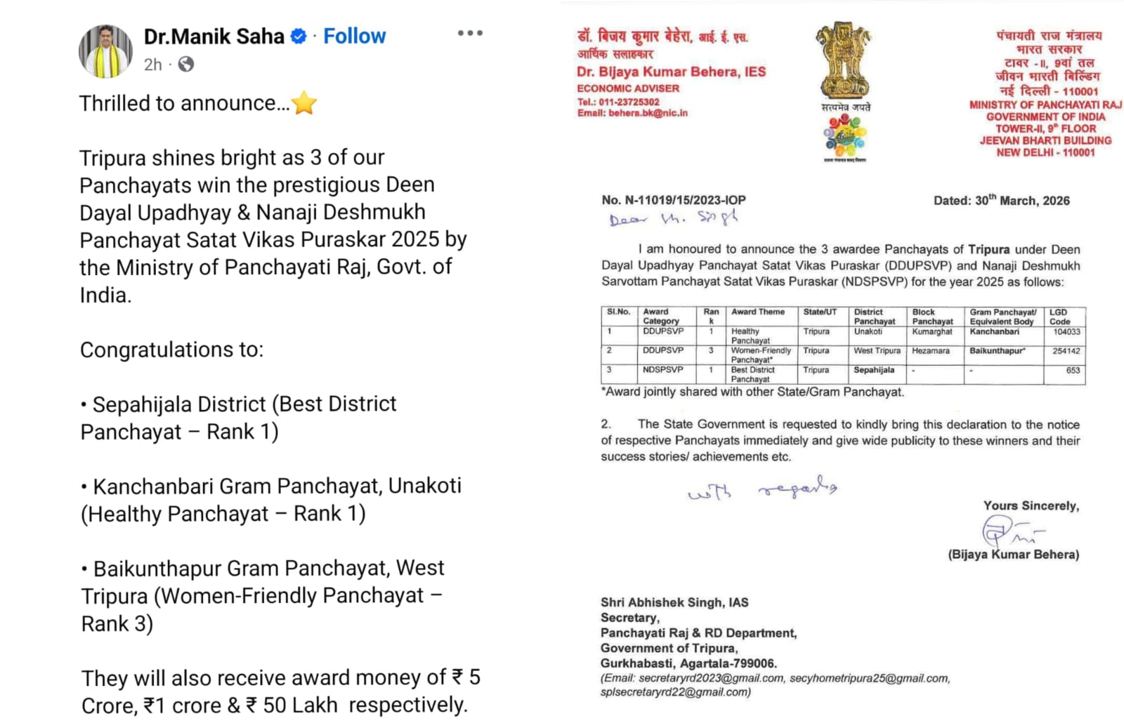 জনতার কলম ত্রিপুরা আগরতলা প্রতিনিধি :- ত্রিপুরা রাজ্য গ্রামীণ শাসন ব্যবস্থায় এক উল্লেখযোগ্য সাফল্য অর্জন করেছে। কেন্দ্রীয় পঞ্চায়েতি রাজ মন্ত্রকের পক্ষ থেকে প্রদান করা ‘দীন দয়াল...