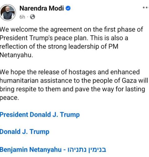 ইসরাইল–হামাস শান্তি চুক্তি স্বাগত জানালেন প্রধানমন্ত্রী নরেন্দ্র মোদী, স্থায়ী শান্তির আশাবাদ ব্যক্ত