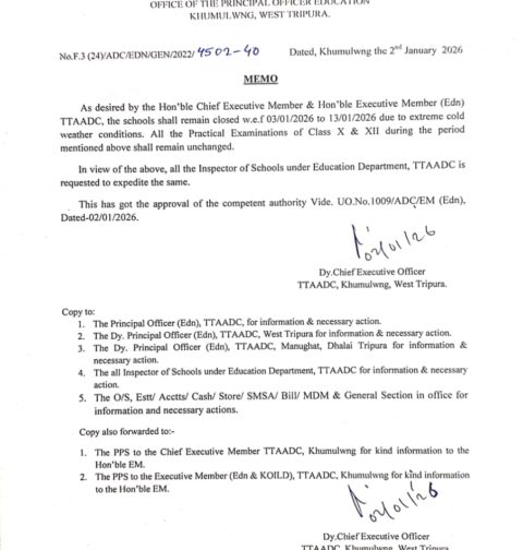 ঠান্ডার দাপটে ৬–১০ জানুয়ারি ত্রিপুরায় সমস্ত স্কুলে ছুটি
